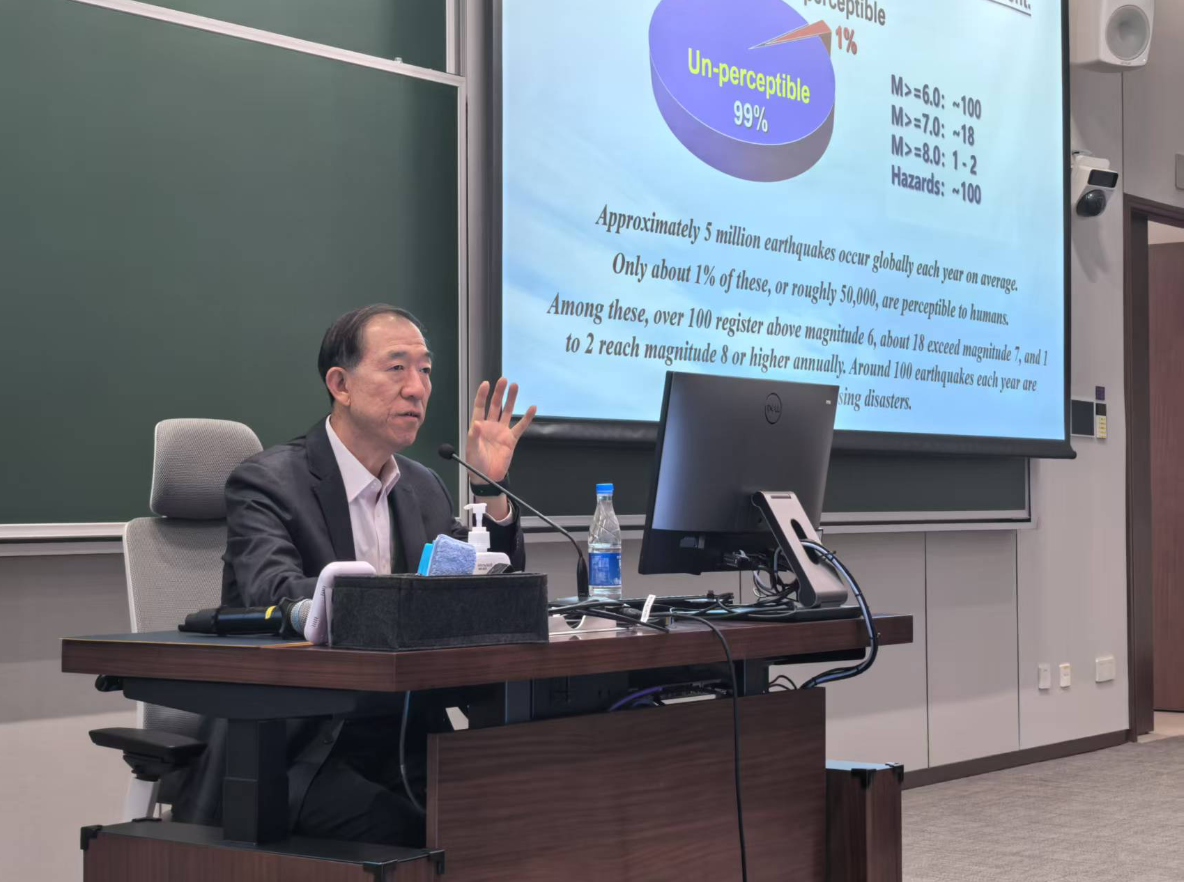 阴朝民从国家治理的宏观视角,为同学们勾勒出中国防震减灾工作的总体框架。讲座分析了地震风险与灾害特征,系统阐述了中国特色的防震减灾工作体系,并分享了在地震科技与综合减灾领域的国际合作成果。讲座使同学们深化了解了我国在地震灾害防范与应对领域的总体情况。