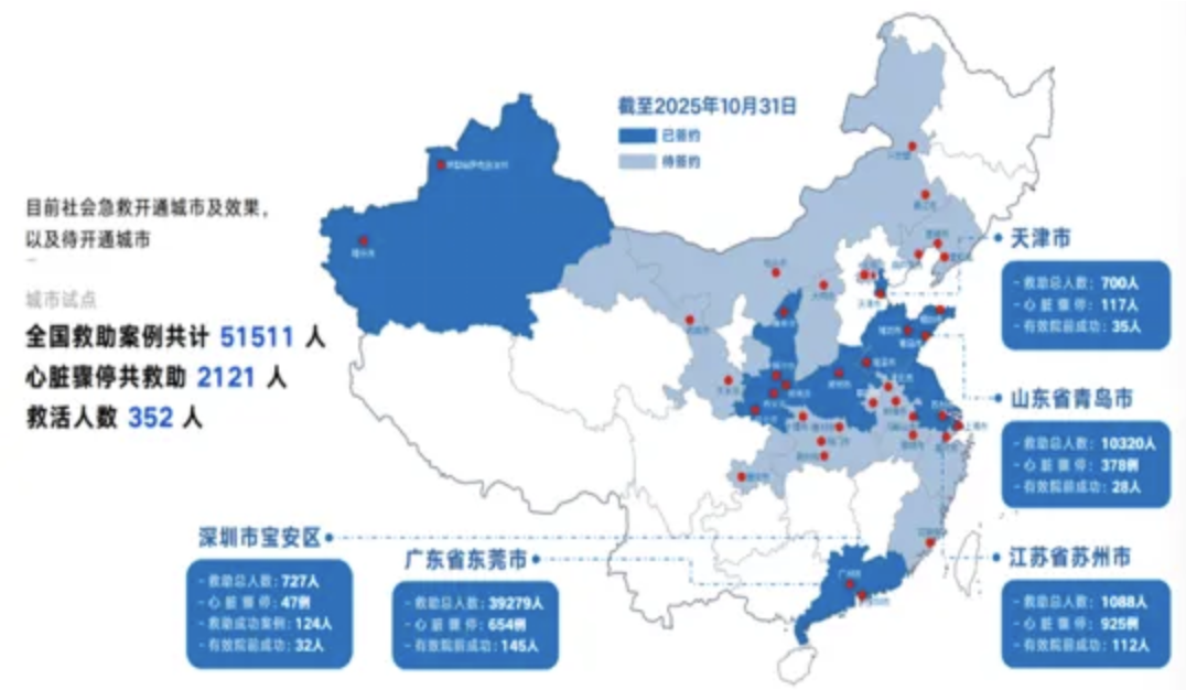 截至2025年6月,项目已实现令人瞩目的成绩:通过“企业捐赠+政府配套+公益众筹”模式,累计新增AED设备4327台,其中自动体外除颤器3892台、便携式急救箱435套;注册认证的急救志愿者达到82.3万人,其中专业志愿者23.7万人,“企鹅急救”平台注册用户达1268万人;项目联合顺丰速运、美团外卖、滴滴出行等构建“移动急救力量”,联动中国红十字会、全国慈善会体系建立志愿者培训认证体系,形成“专业救援+社会参与”互补格局。以苏州市为例,项目实施后,心脏骤停患者的存活率从3.2%提升至23.8%,按发病基数估算,每年仅苏州市就可能多挽救约500名患者的生命。